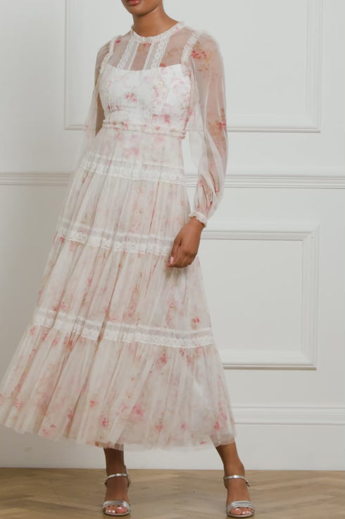 The Enchanted Garden Lace Ankle Gown in Moonshine. Beautifully designed with a signature Needle & Thread style print taken from archive hand-painted wallpaper depicting romantic garden florals and historical motifs. Inspired by Victorian styling, featuring lace trims that are perfectly positioned along gently gathered skirt tiers, adorning this printed tulle gown. Crafted with sheer printed blouson sleeves with ruffle cuffs and softly gathered tulle frills decorate the neckline, armhole, and waistband. The skirt is made up of layers of signature Needle & Thread soft tulle for romantic styling. A contemporary style you'll forever treasure.