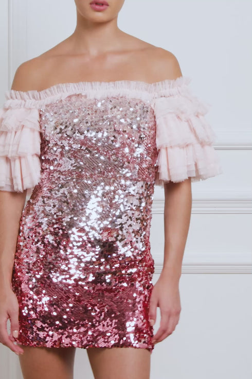 NEEDLE & THREAD EXCLUSIVE. The Essie Ombre Off-Shoulder Micro Mini Dress in Bright Pink. This playful dress is crafted with an off-shoulder design. Beautifully decorated with frothy layered sleeves in soft, delicate tulle. Designed with a slim silhouette, in a micro mini length, decorated with glittering sequins in an ombre effect, transitioning from soft blush pink to bright pink towards the hem. The perfect party dress you'll wear time and time again.