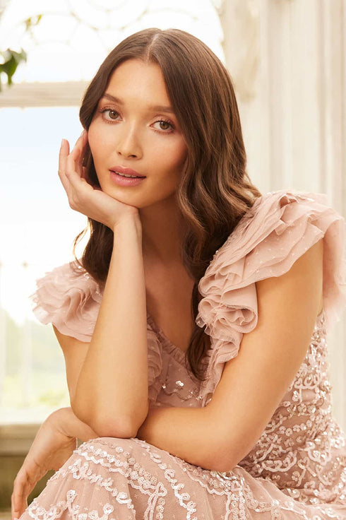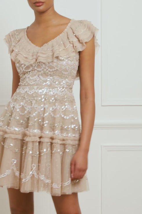 The Everthine Micro Mini Dress in Sand. This dress is inspired by the hand-scripted love letters of Beethoven, featuring the words 'ever thine ever mine ever ours' on a delicate border. Beautifully designed with intricate sequin artwork developed from the smallest sequin to capture the exquisite detailing. Designed with a vintage, couture-style neckline and adorned with layers of soft tulle and net to create a voluminous, show-stopping skirt shape. This romantic dress will be a piece you'll forever treasure.