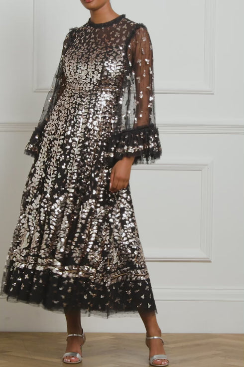 The Fern Ankle Gown in Graphite/Caramel. Inspired by a historical archive artwork, this gown features a shimmering statement sequin border on the skirt hem with a trailing glittering motif design that disperses towards the dress. Crafted in soft tulle with signature Needle & Thread frills, this luxurious style boasts voluminous sleeves with embellished motifs and romantic frills at the cuffs, adorned with glistening sequins. The sequins have a special high-shine gloss finish created by extra foil coating. The skirt is generously made up of layers of soft, delicate tulle and net. A classic and contemporary style.