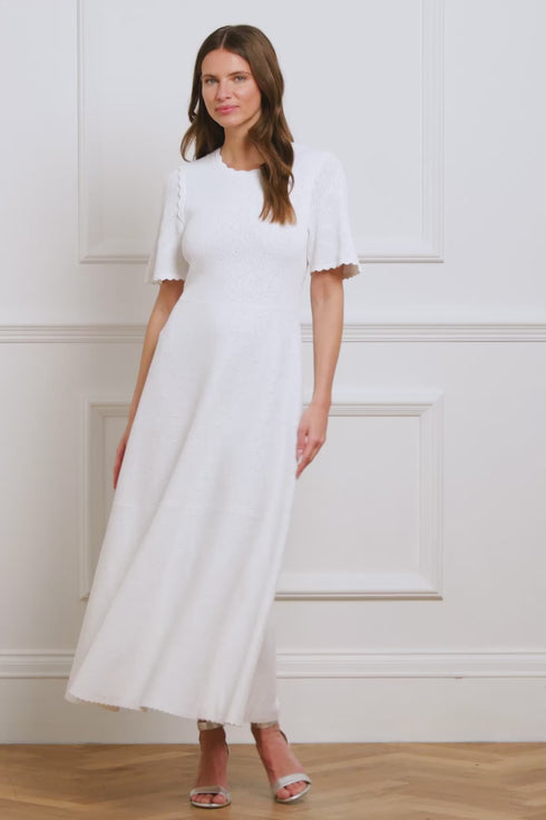 The Floral Pointelle Knit Gown in Cream is crafted from a recycled viscose blend with stretch yarn for a beautifully flattering texture. Inspired by vintage lace, its stitch pointelle details showcase delicate floral motifs, adding a touch of intricate charm. The fitted stretch bodice features a feminine V-neckline and scalloped trim, enhancing the gown's romantic appeal.