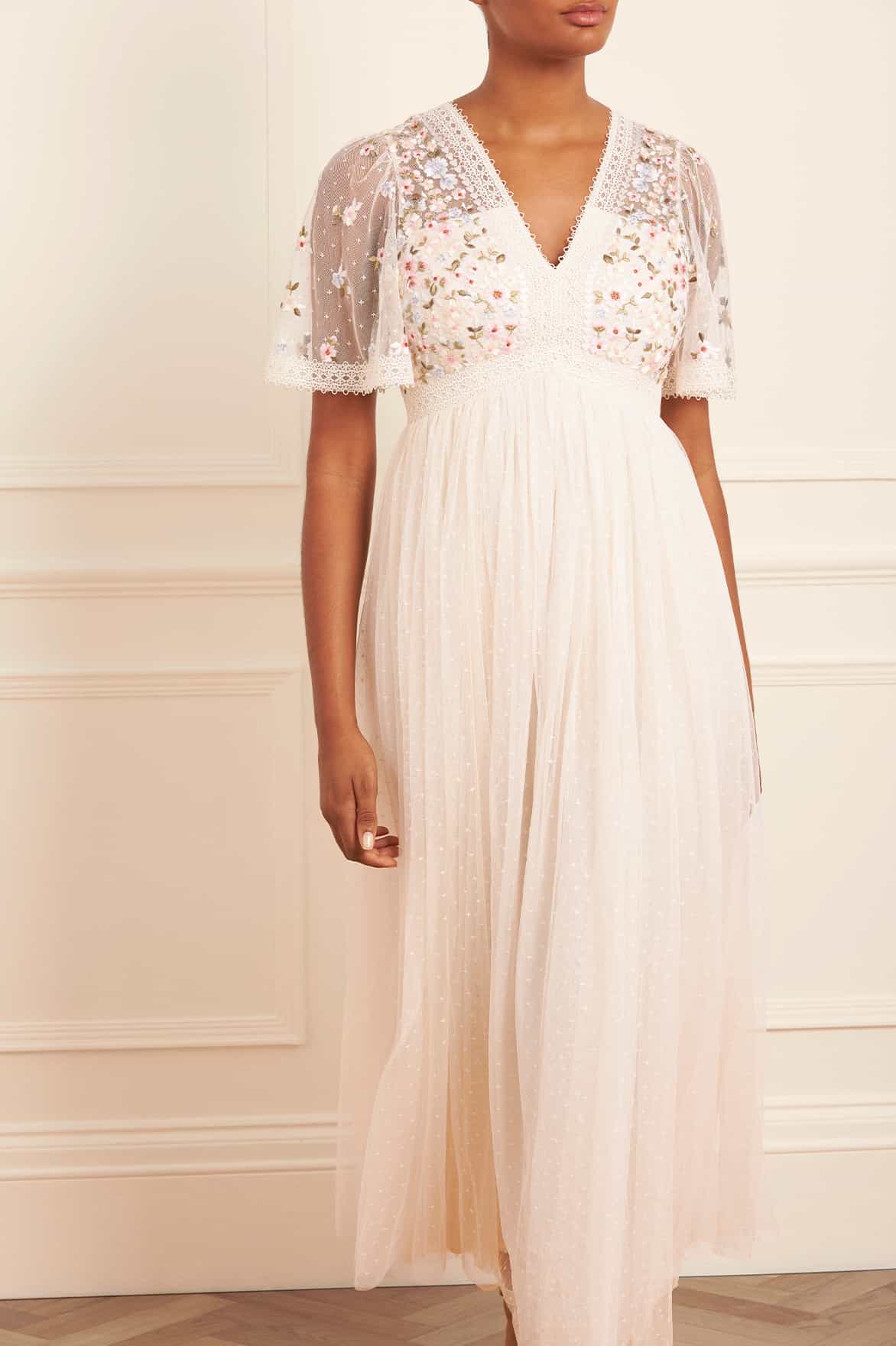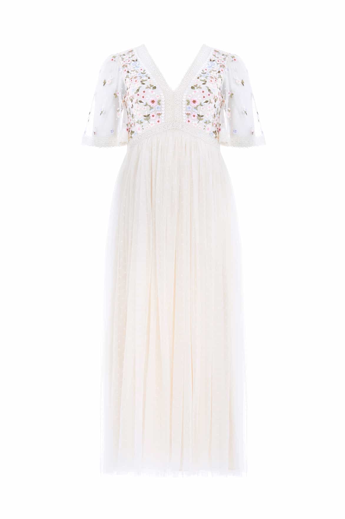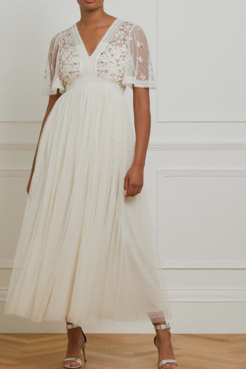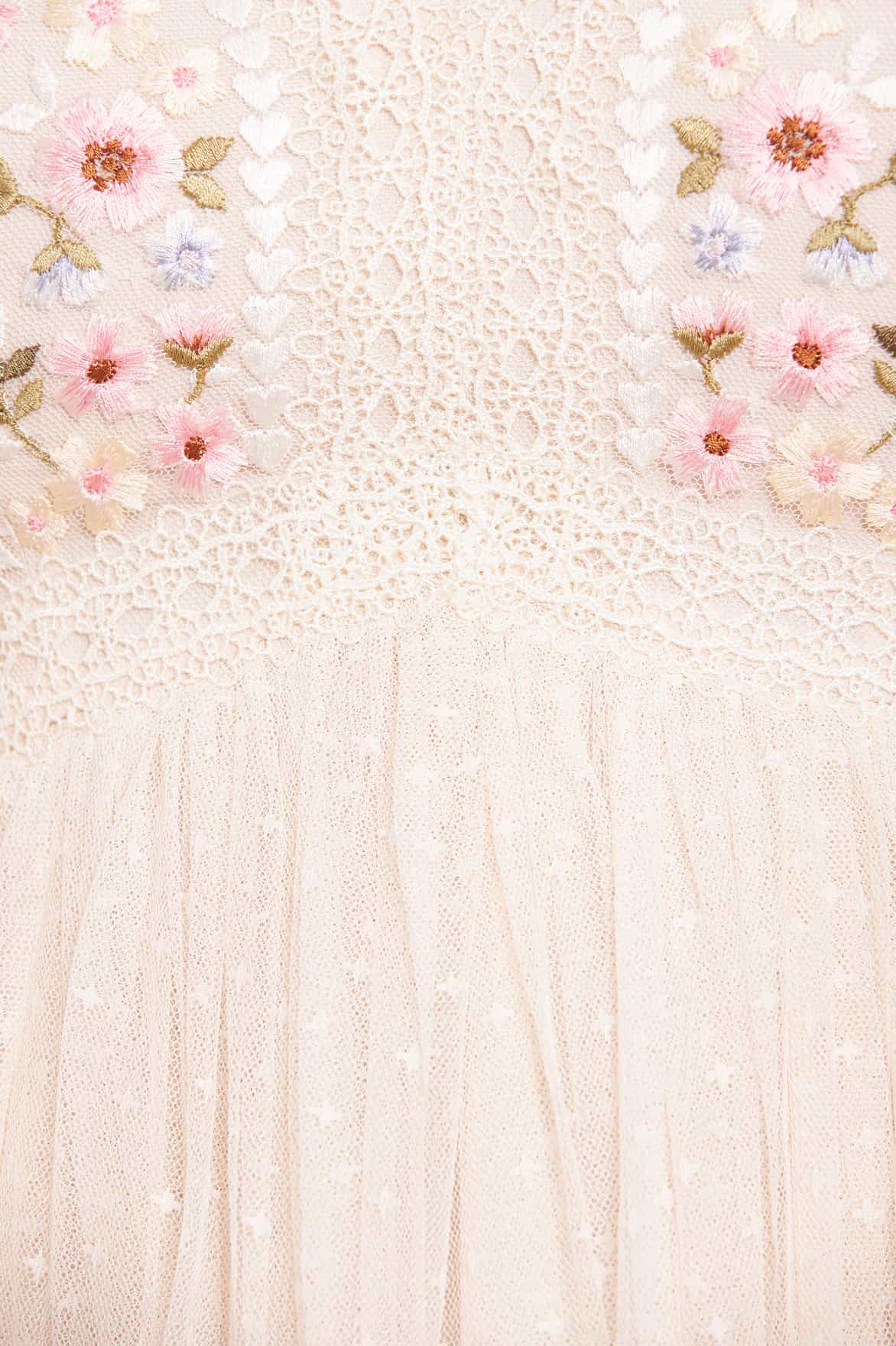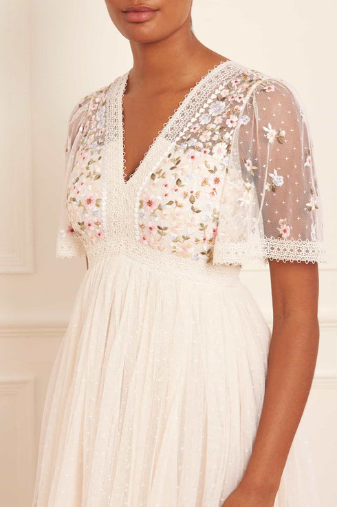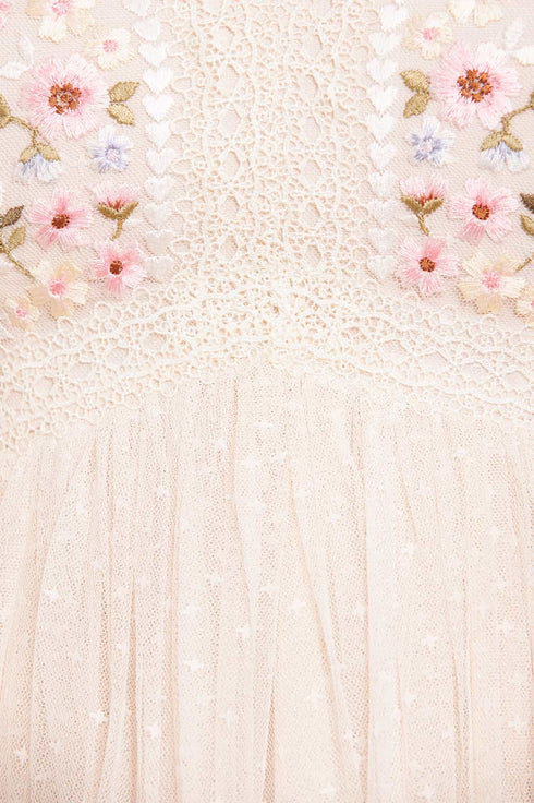 The Garland Ribbon Bodice Ankle Gown in Cream. This embroidered gown is inspired by Victorian lace trims. The bodice of this gown is designed beautifully with floral embroideries in soft pastel tones. Developed with a V-shaped waist seam to create a flattering, effortless fit. This gown is adorned with intricate lace trims for signature Needle & Thread detailing. Crafted with a layered tulle skirt, creating romantic, effortless styling. The perfect piece for a special occasion.