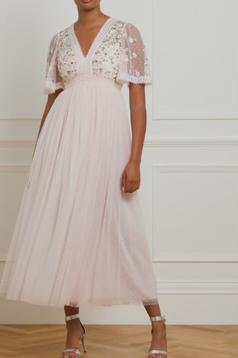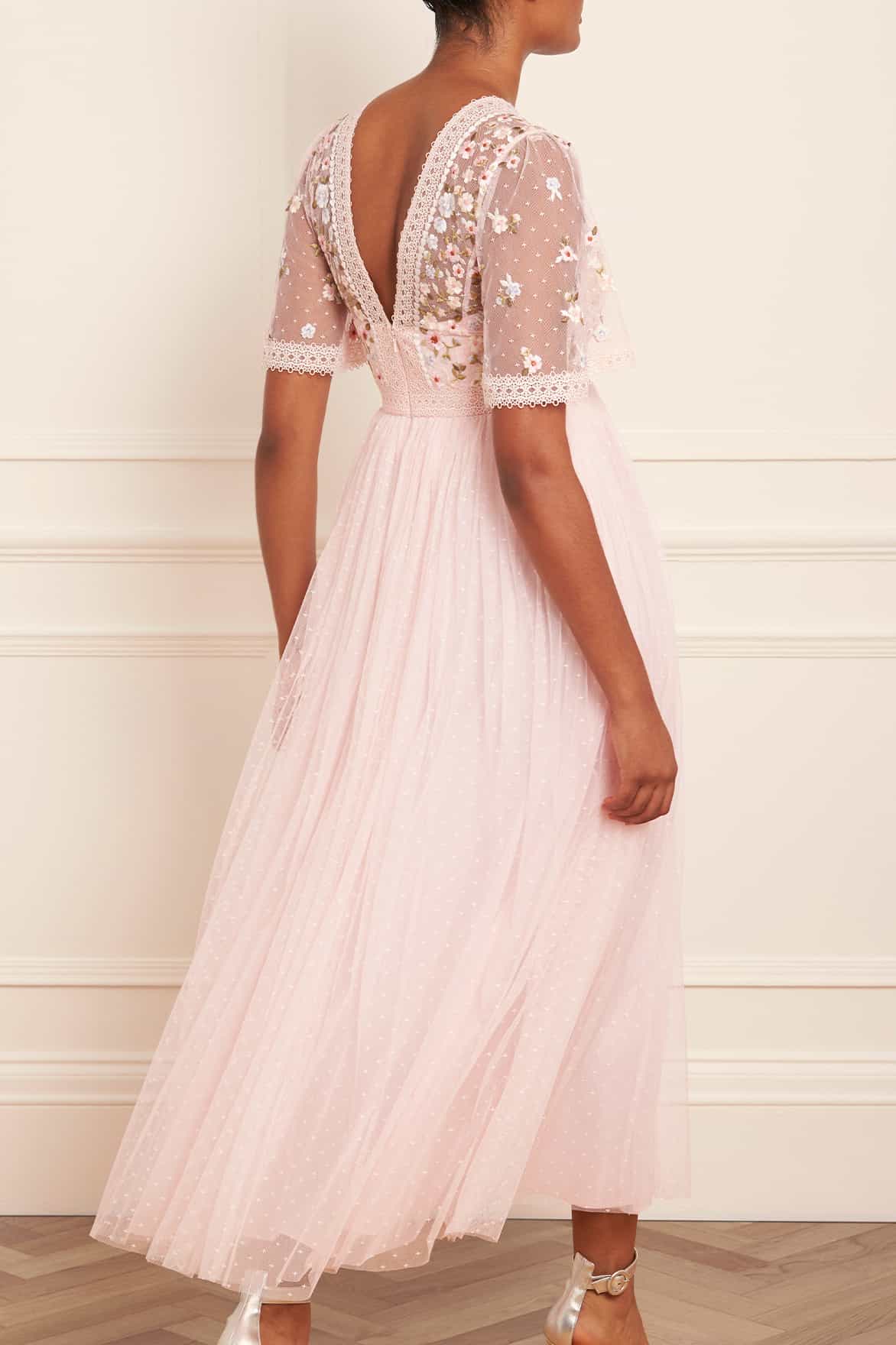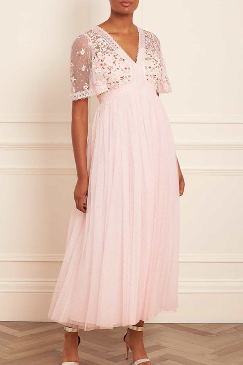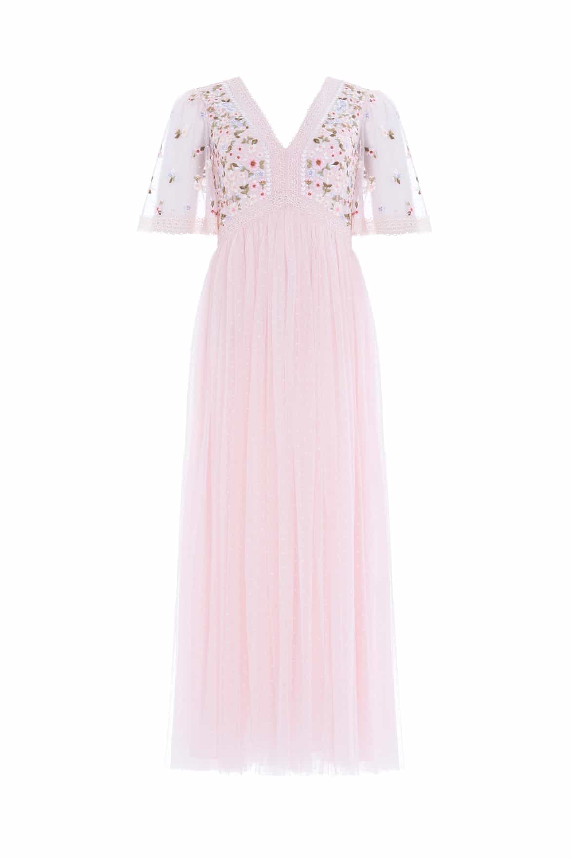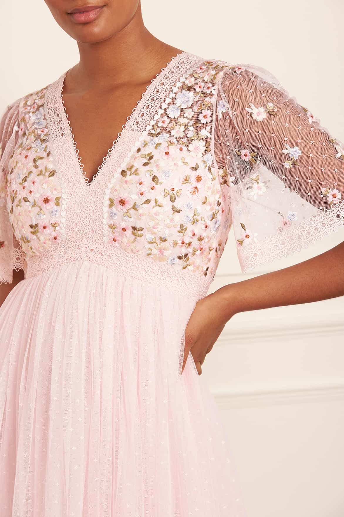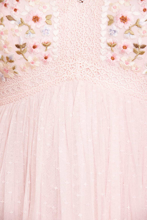 The Garland Ribbon Bodice Ankle Gown in Peony Pink. This embroidered gown is inspired by Victorian lace trims. The bodice of this gown is designed beautifully with floral embroideries in soft pastel tones. Developed with a V-shaped waist seam to create a flattering, effortless fit. This gown is adorned with intricate lace trims for signature Needle & Thread detailing. Crafted with a layered tulle skirt, creating romantic, effortless styling. The perfect piece for a special occasion.
