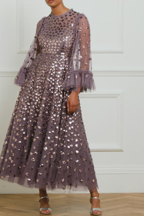 The Glisten Long Sleeve Ankle Gown in Amethyst. This ethereal gown is adorned with shimmering sequin motifs that scatter towards the hem. Crafted with romantic fluted bracelet-length sleeves with frill cuffs, decorated with scattered sequin motifs. Beautifully trimmed with signature Needle & Thread soft tulle ruffles at the neckline and shoulder add to the romantic styling. The skirt is composed of generous layers of net and tulle for a sweeping hemline. A statement piece you'll forever treasure.