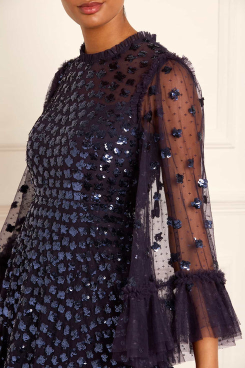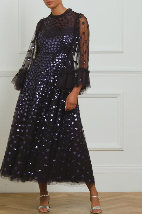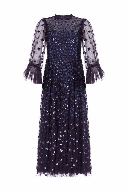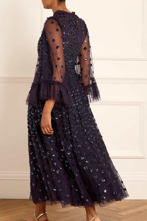 The Glisten Long Sleeve Ankle Gown in Midnight. This ethereal gown is adorned with shimmering sequin motifs that scatter towards the hem. Crafted with romantic fluted bracelet-length sleeves with frill cuffs, decorated with scattered sequin motifs. Beautifully trimmed with signature Needle & Thread soft tulle ruffles at the neckline and shoulder add to the romantic styling. The skirt is composed of generous layers of net and tulle for a sweeping hemline. A statement piece you'll forever treasure.