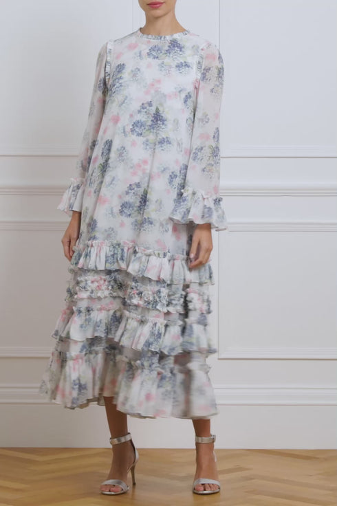 The Hydrangea Chiffon Round Neck Ankle Gown in Moonshine. An exquisite statement print taken from the archive, this hand-painted artwork from the early 1900s depicts blooms of hydrangea flowers and smaller trailing florals, all rendered with a soft watercolour feel. The effortless, loose-fitting silhouette is crafted in soft chiffon, creating a romantic, floaty look. The semi-sheer chiffon fabric is complemented by a separate slip underneath, adding chic modesty to the design. Crafted with layered frills towards the hem showcase the Needle & Thread signature look, combining a relaxed yet statement style.