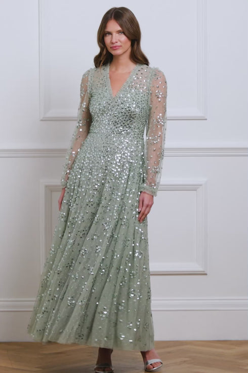 The Leila Dot V-Neck Ankle Gown in Bay Green is adorned with shimmering clustered dot motifs, creating a sparkling effect. This elegant V-neck gown features slim sleeves, with signature Needle & Thread tulle frills at the neckline and armholes. The skirt, crafted from layers of net and tulle, finishes with a sweeping hemline. A captivating design with dramatic flair.