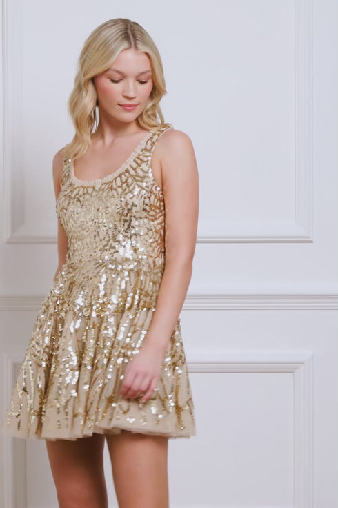 The Marquet Scoop Neck Micro Mini Dress in Parchment/Metallic, inspired by the 1900s French ballet La Papillon, features a glittering butterfly design that fades towards the hem. With an elegant scoop neckline and signature Needle & Thread frill, the layered soft tulle skirt adds a romantic touch. Make this your new wardrobe favourite.