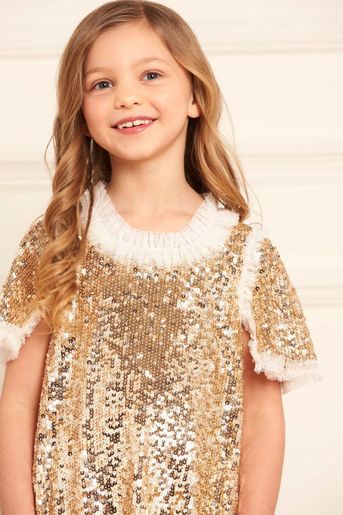 The Matilda Dress in Gold. This beautiful dress is decorated with shimmering sequins, creating an ultimate sparkle. Designed with square cut sleeves trimmed with tulle ruffles to add a Needle & Thread signature look. Update your little one's wardrobe with the ultimate fairy-tale dress of the season.