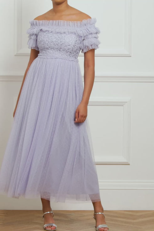 The Midsummer Lace Bodice Off Shoulder Ankle Gown in Iris Blue. This gown is an update of our bestselling signature style. Beautifully developed with layers of soft, delicate tulle and an off-the-shoulder shape to create a romantic silhouette. The bodice is scattered with vintage-inspired embroidered motifs for a signature Needle & Thread look. The perfect style for a bridesmaid or special event.