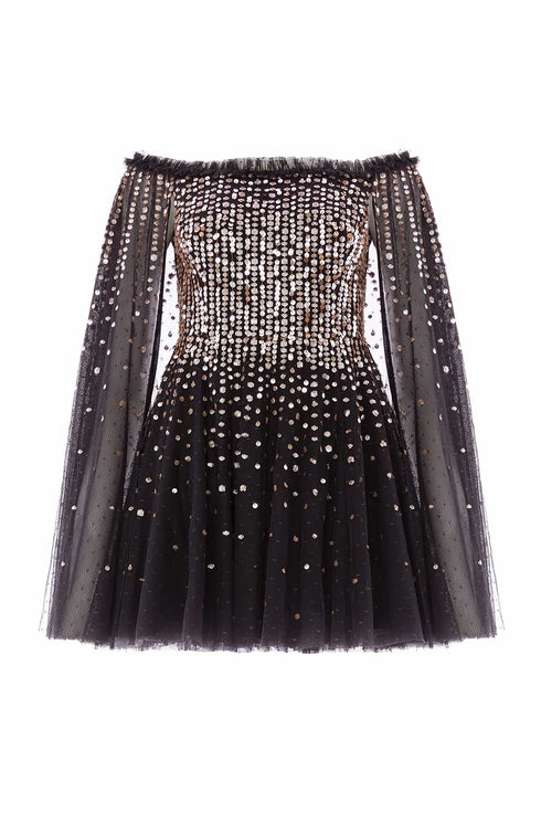 NEW SEASON. The Moonlight Sequin Cape Micro Mini Dress in Graphite/Metallic. Sparkle like a starry night sky with this showstopping party style. Cape-style sleeves drape elegantly from the shoulders, while the body is adorned with sequins that catch and scatter light like constellations. Playful and striking, this dress embodies the celestial mood of the Bright Star collection.