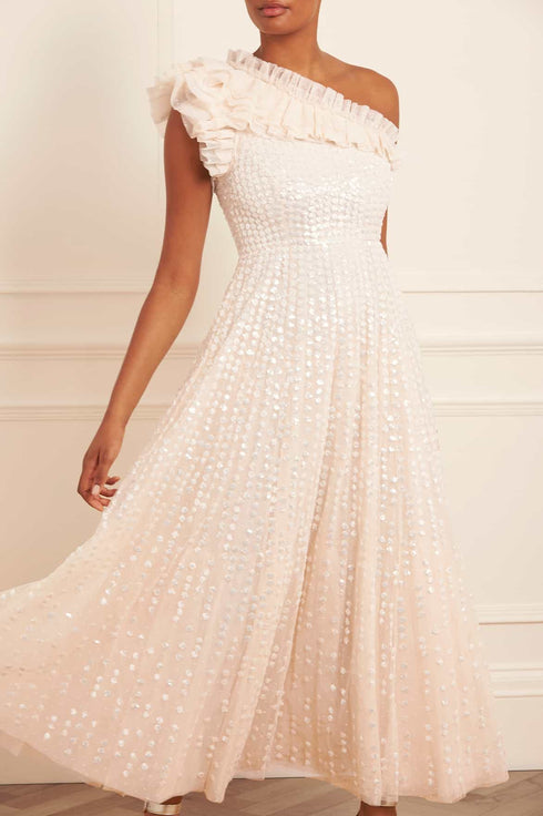 The Raindrop One Shoulder Ankle Gown in Cream / Cream. This gown is beautifully adorned with an enchanting sequin artwork. The artwork is designed with delicate shimmering polka dot sequins in a linear formation capturing the essence of glistening raindrops. Designed with an off-the-shoulder style for elegant detailing. The skirt is made from layers of frothy tulle featuring statement frill details, creating a signature romantic look. The gown is perfect for an upcoming special event.