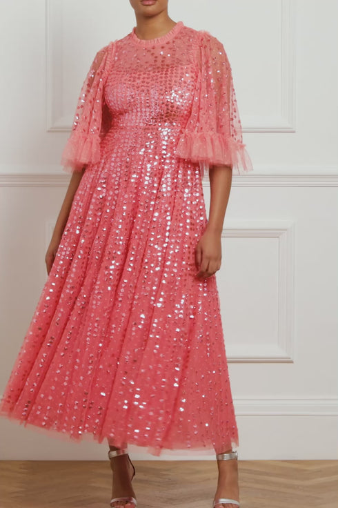 The Raindrop Short Sleeve Ankle Gown in Pink Sky. This gown is beautifully decorated with polka dot sequin motifs in a linear formation artwork, capturing the essence of glistening raindrops. The sequins used have a special high-shine, gloss finish created from extra foil coating added to each sequin to create this extra lustrous look. Developed with voluminous sleeves, cut generously with gently gathered frills at the hem. A season favourite at Needle & Thread HQ.