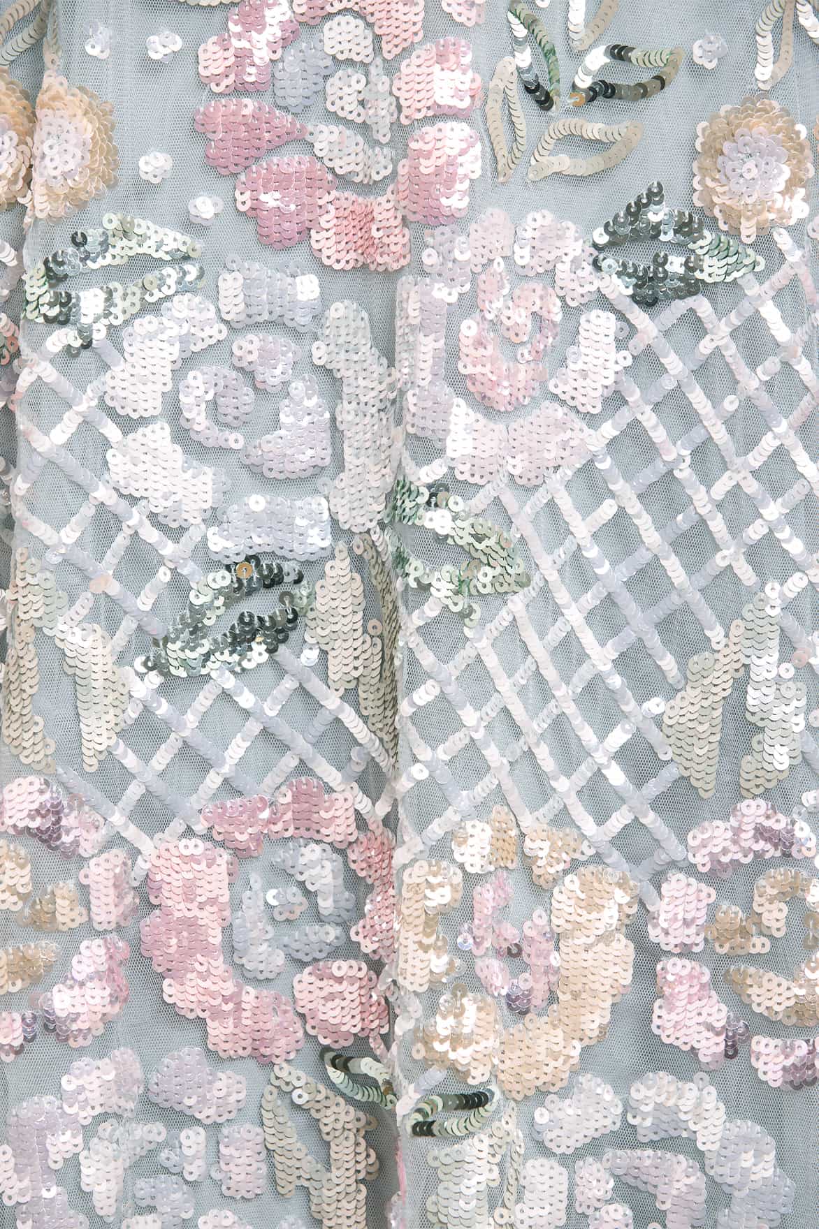 The Rosalie Ankle Gown in French Blue. This exquisite piece from Needle & Thread’s heritage collection is a masterclass in timeless elegance. The statement multicolour design is crafted from countless glittering sequins, artfully arranged in floral motifs within linear bands, accented with delicate dotted sequin and crosshatch details. Crafted with signature Needle & Thread tulle frills across the neckline and armholes, adding a touch of sophistication, while the blouson sleeves feature softly gathered elastic cuffs with refined frill edges. The skirt, composed of layers of luxurious soft tulle, flows effortlessly, creating a romantic and ethereal silhouette. This gown is the perfect embodiment of artistry, luxury, and timeless refinement.