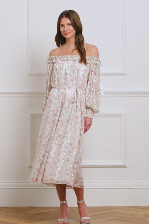 The Rose Ditsy Lurex Midaxi Dress in Moonshine/Pink. This dress features a romantic floral print inspired by 1800s hand-painted wallpaper, with a subtle leopard print on glittering gold lurex georgette. The off-the-shoulder shirred neckline is edged with signature frills, while braided silk tassels adorn the shoulder ties. Developed with blouson sleeves with ruffle cuffs add a romantic touch. The loose fit offers comfort, and a slim self-fabric tie at the waist allows for styling versatility.