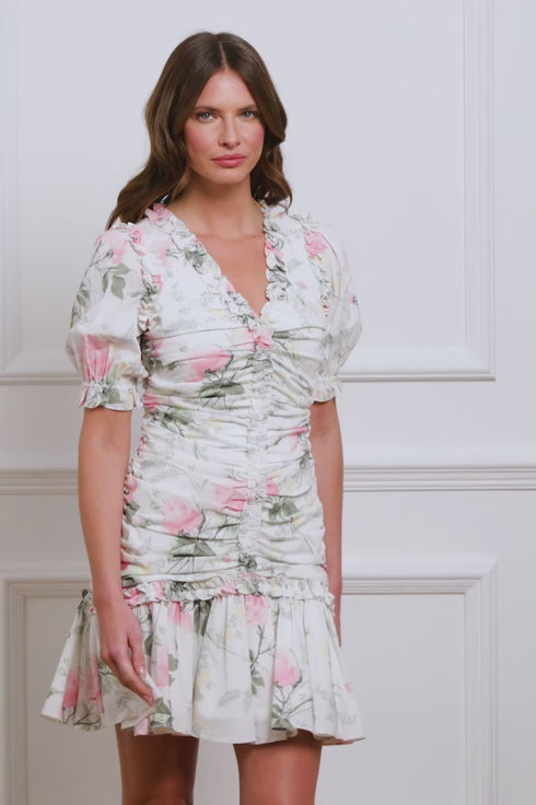 - Floral printed crepe decorated with printed ruffles