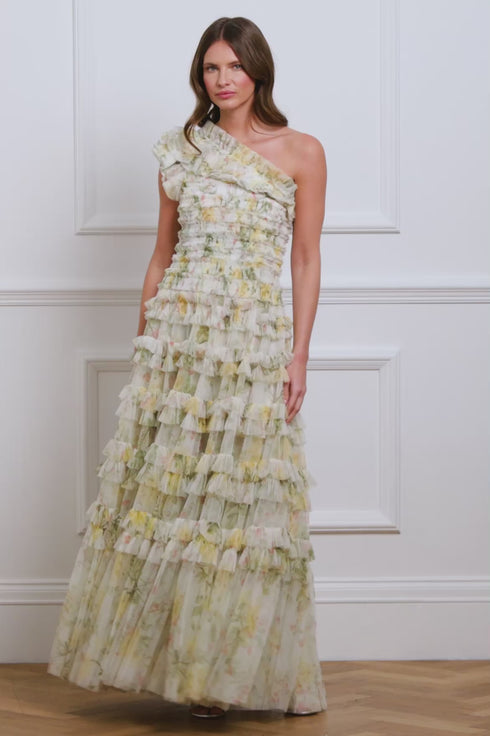 The Rose Lisette One-Shoulder Gown in Moonshine/Yellow features a romantic print inspired by antique hand-painted artwork with large rose blooms and trailing florals. This Hollywood-inspired gown showcases an elegant one-shoulder design, with double-stitched tulle frills graduating towards the hem. The layered net and tulle skirt finishes with a sweeping hemline, creating a beautiful silhouette. Perfect for any special occasion.