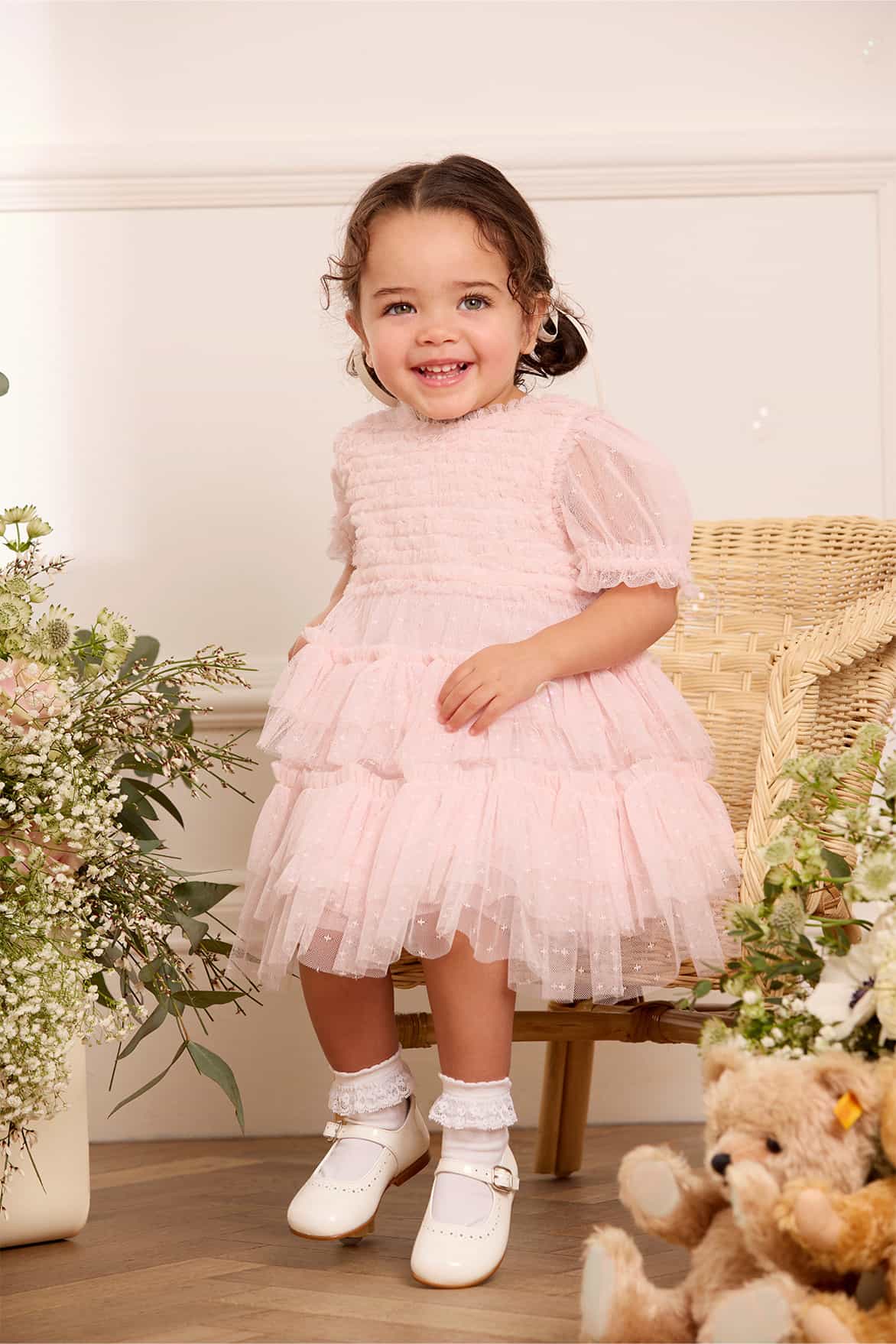 NEW SEASON. The Ruffle Frill Baby Dress in Peony Pink. This enchanting dress features frothy tulle ruffles that create a playful texture, with layers of gathered frills on the skirt for added volume. Lined in the softest cotton voile for comfort, it includes matching cotton dobby bloomers, delicately edged with frills. The perfect dress for a special occasion or simply for those who love to dress in luxury.