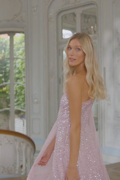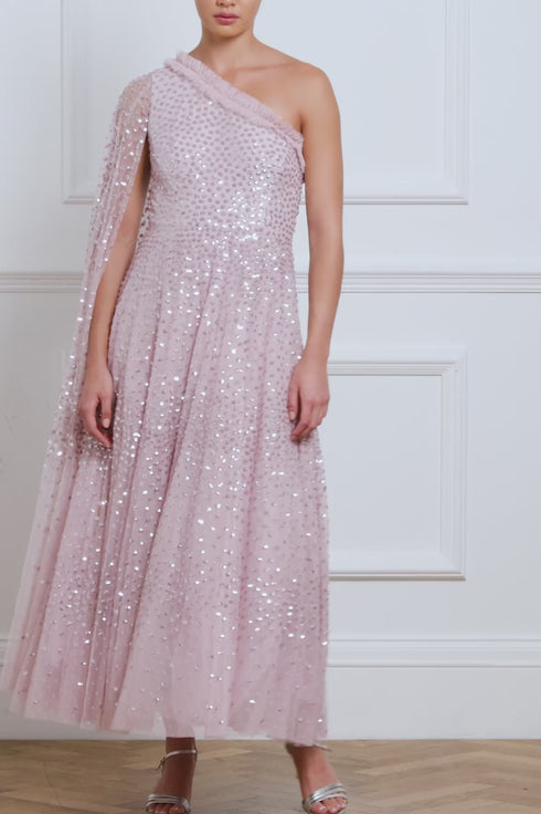The Scatter Dot One-Shoulder Ankle Gown in Misty Lilac. This embellished gown is decorated with exquisite shimmering dot motifs, undulating in wave formations for a captivating glittering effect. This gown features a sweeping floor-length cape sleeve for romantic detailing and a statement look. The flattering one shoulder neckline is trimmed with signature Needle & Thread tulle frills. The skirt is made up of generous layers of net and tulle with sweeping hemline. The perfect gown for an upcoming special occasion.