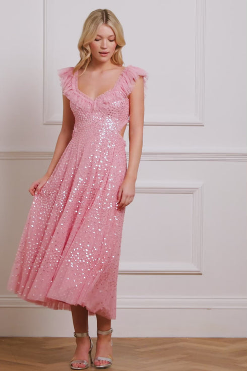 The Scatter Dot Ruffle Backless Ballerina Dress in Sugar Pink. This dress features shimmering dot motifs that fade towards the hem for a captivating glittering effect. The backless design adds a playful, romantic touch, while frothy tulle sleeves and signature Needle & Thread ruffles enhance the neckline and back. A flattering V-shaped waist panel completes the look. The high-shine sequins, with a foil coating, add a lustrous finish. This enchanting dress is perfect for any special occasion.