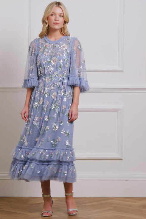 The Sequin Dandelion Gloss Ballerina Dress in Sky Blue is inspired by Victorian botanical artist Marianne North. This dress features shimmering dandelion floral sequins that delicately scatter towards the hem, creating a radiant effect. The sequins have a high-shine gloss finish, enhanced by a foil coating. With a loose, floaty silhouette and voluminous sleeves, this romantic dress is perfect for any special occasion.
