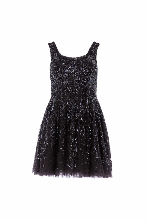 NEW SEASON. The Sequin Ribbon Scoop Neck Micro Mini Dress in Graphite. Featuring ribbon-inspired sequin embroidery scattered with twinkling dots, the fitted bodice flows into a short, flattering silhouette. The scoop neckline enhances its femininity, while the graphite colourway lends sophistication and edge. A modern party dress with celestial sparkle.