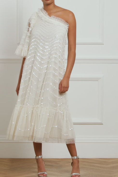 NEW SEASON | NEEDLE & THREAD EXCLUSIVE. The Shimmer Wave Gloss One-Shoulder Ballerina Dress in Cream. This ballerina dress is developed with a one-shoulder design and a generous, voluminous sleeve for elegant detail. Adorned with a shimmering artwork in high gloss sequins. This style is inspired by the sea waves of the Riveria, featuring delicate sequins creating undulating borders for a romantic, glistening effect. The skirt is made up of layers of signature Needle & Thread soft tulle. A Needle & Thread season favourite.