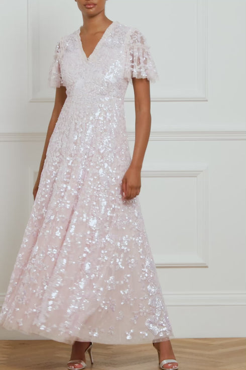 The Trailing Bow Gown in Peony Pink. A true statement piece in the collection. This gown is designed with an intricate artwork and ribbon bows cascading down the gown. Featuring scattered floral and scallop motifs for romantic detailing. Crafted with specially sourced sequins to add extra sparkle, and a generously sweeping hemline made from layers of tulle and net for striking movement. An eye catching piece for a special occasion.