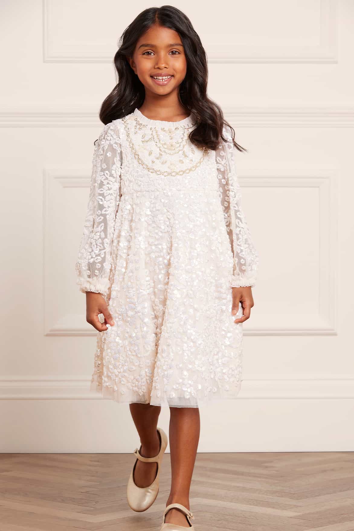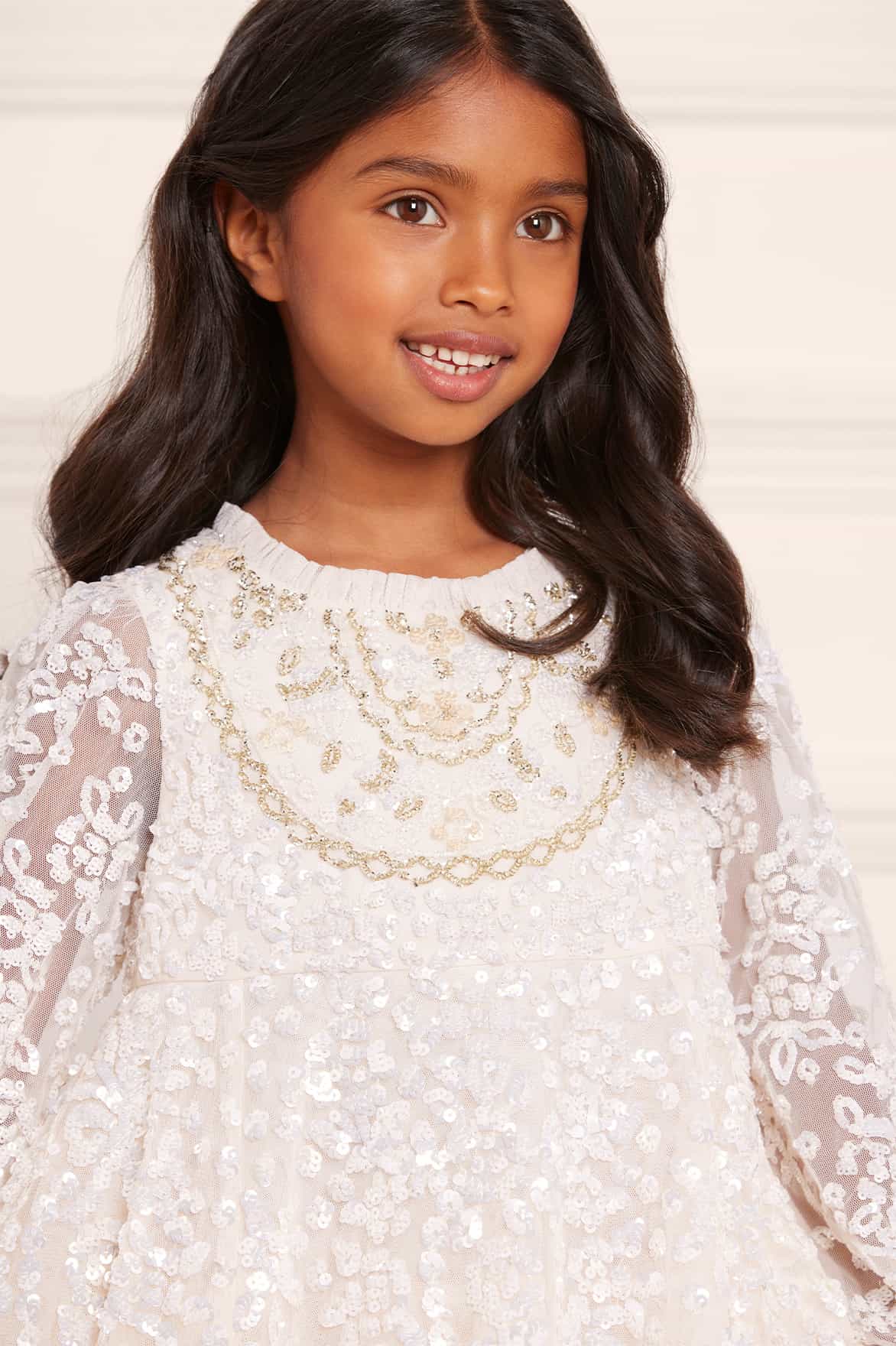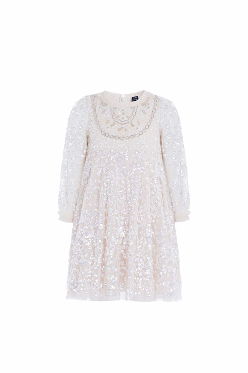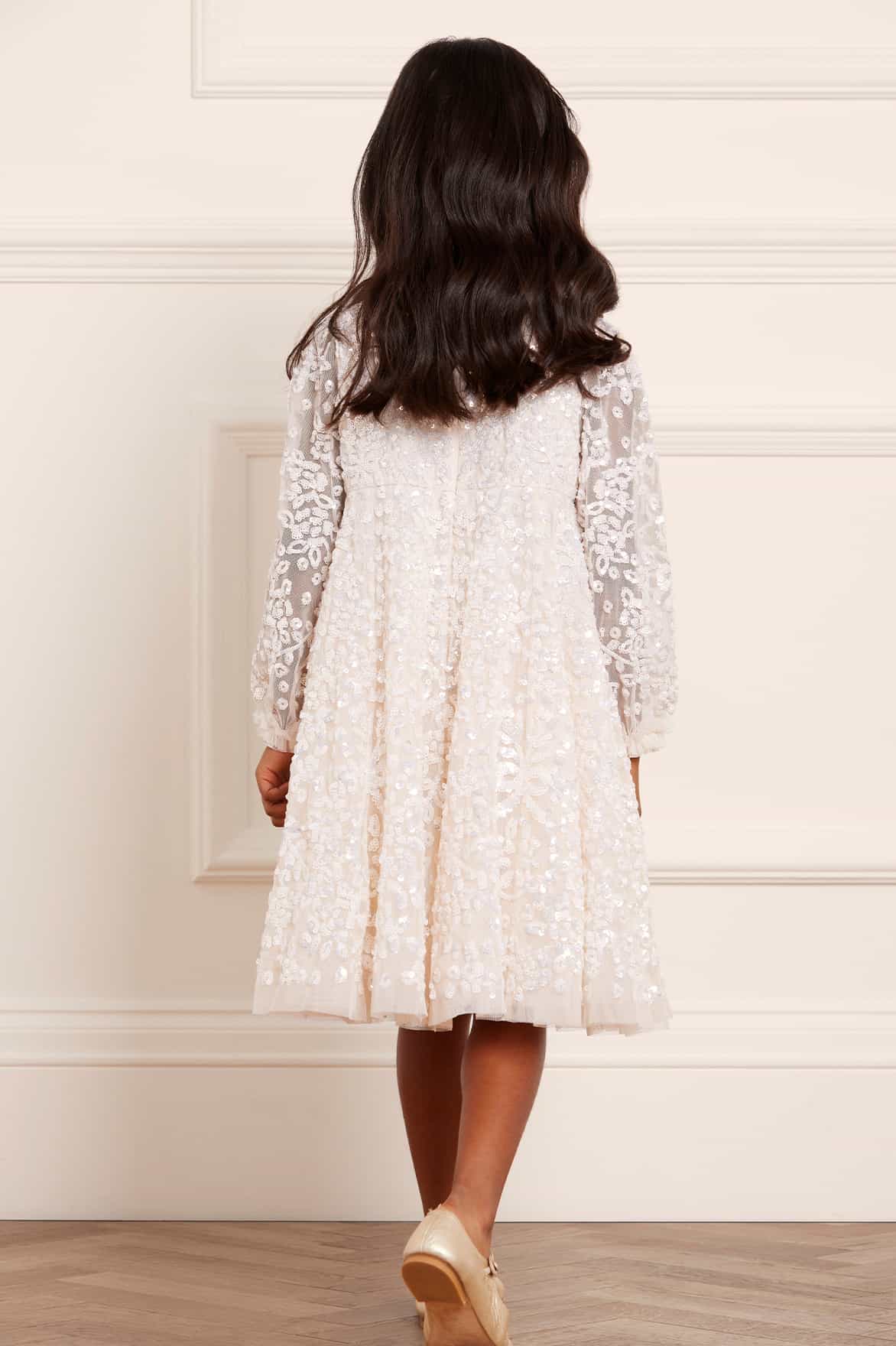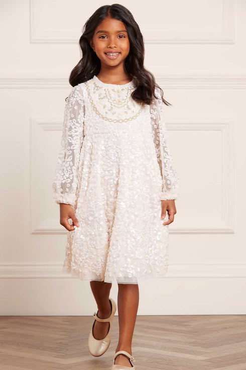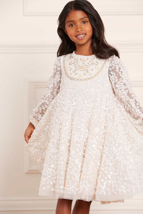 The Victorian Wreath Gloss KIDS Dress in Cream. This dress is intricately adorned with sequins featuring floral and bow motifs in a wreath inspired layout. Featuring Victorian inspired panelling detail on the front of the bodice. Designed with signature Needle & Thread soft tulle frills on the neckline and cuffs. Let your little one sparkle under the spotlight at their next occasion.