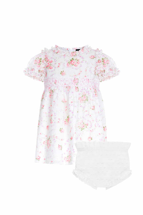 NEW SEASON. The Vintage Ditsy Cotton Short Sleeve Baby Dress in Moonshine. Inspired by a 1900s hand-painted wallpaper design, this enchanting dress features clusters of ditsy roses and delicate florals. The bodice is beautifully smocked with intricate embroidery, while short puff sleeves are finished with ruffled cuffs. The gently gathered skirt is trimmed with playful frills for added volume. Lined in the softest cotton voile for comfort, the dress is completed with matching cotton dobby bloomers, delicately edged with frills. The perfect choice for a summer holiday.